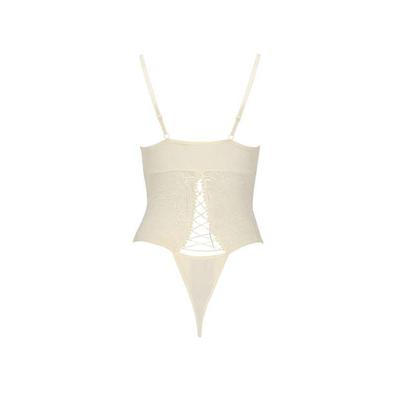 An elegant, sensual and erotic bodysuit. This bodysuit has a chest covered by silky white lace and a bow in the center that gives sensuality.