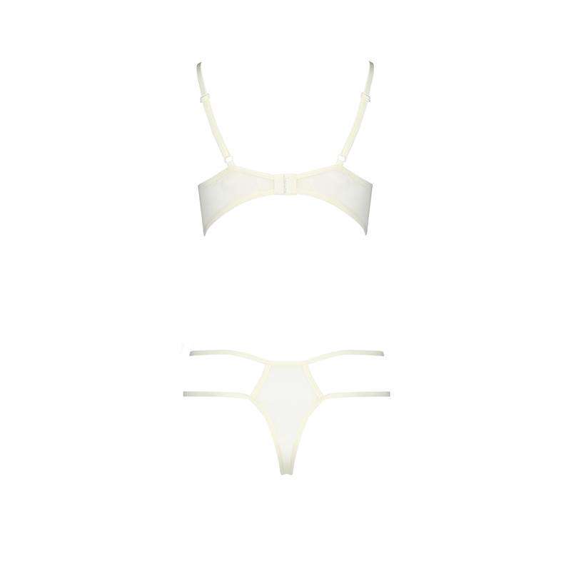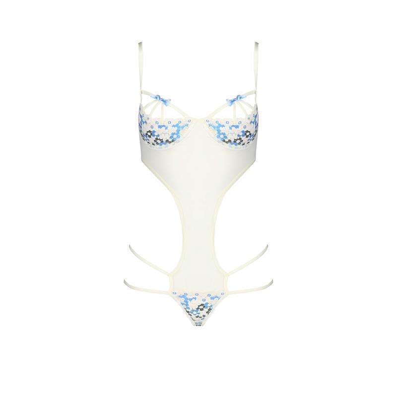 In this case, a very sensual bodysuit in white with blue details. It has very erotic details, a bra with open cups, a semi-open central part, with straps at the hips that are joined to a thong, and in the back, the back is completely open.
