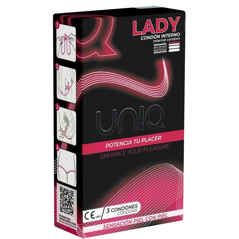 Uniq Lady are extra-resistant and hypoallergenic female condoms, made with latex-free AT-10 resin. Designed for maximum pleasure while keeping you more secure, Uniq Lady provides much more sensitivity than other condoms. You no longer have to worry about men putting on a condom: use yours instead. Once Uniq Lady condoms are put on, neither you nor your partner will be able to feel it. You will only see sexy lace garters wrapped around your thighs. Transparent, lubricated and odorless condoms are compatible with any type of lubricant.
