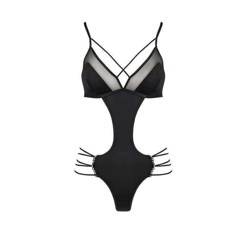 Within the Avanua collection we present the Quella line. With this semi open bodysuit in black you can enjoy a night of passion like never before feeling sensual and sexy. It has strips that surround your hip and your breasts, hugging your curves.