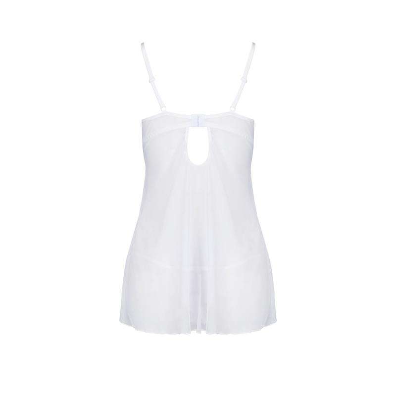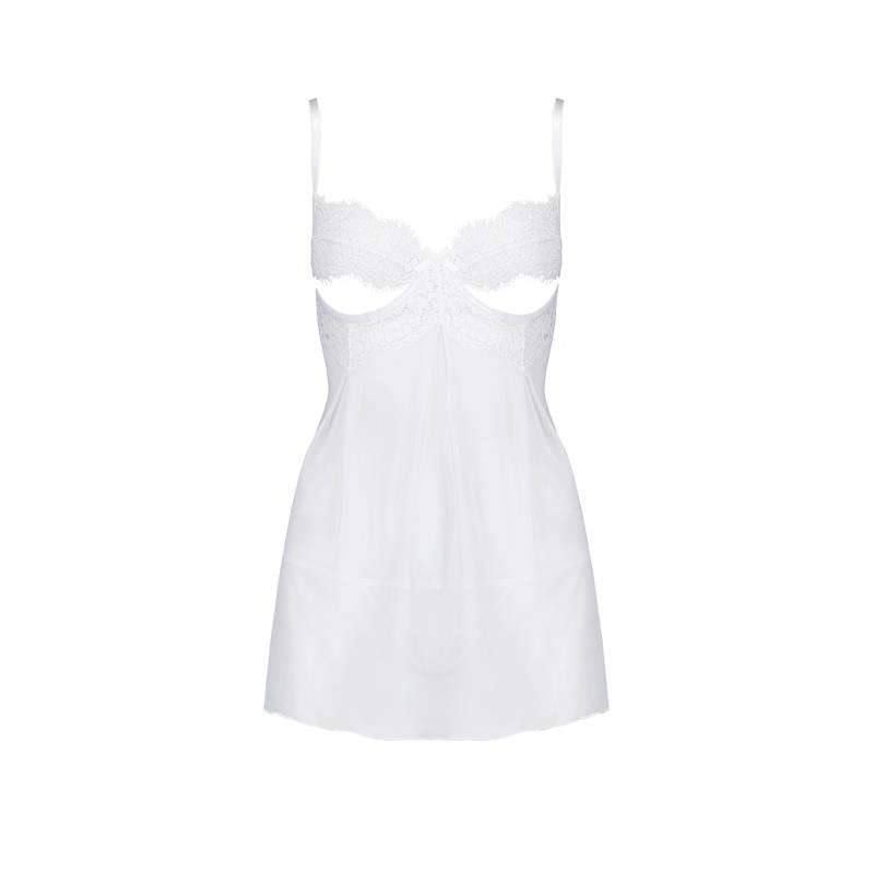 In this case, a chemise of a medium length, semi transparent and in an off-white color. The part of the bra has open cups and floral details with lace that will not leave anyone indifferent.